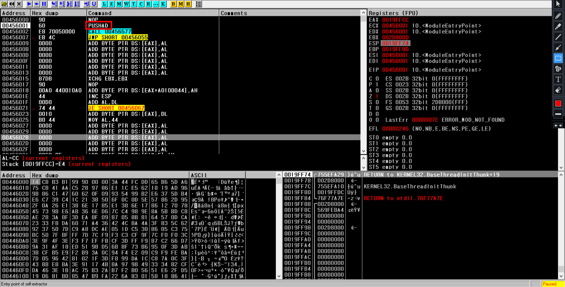 'PUSHAD'가 보인다 그럼 POPAD도 있다는 것을 유추할 수 있다.