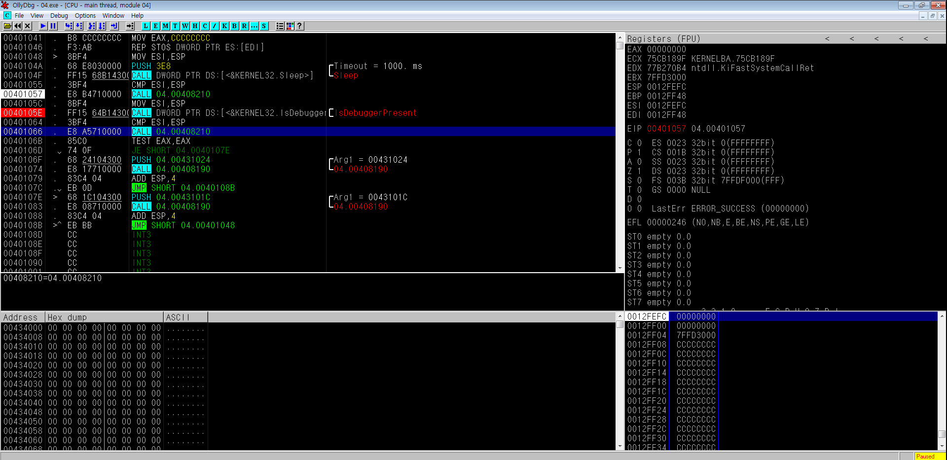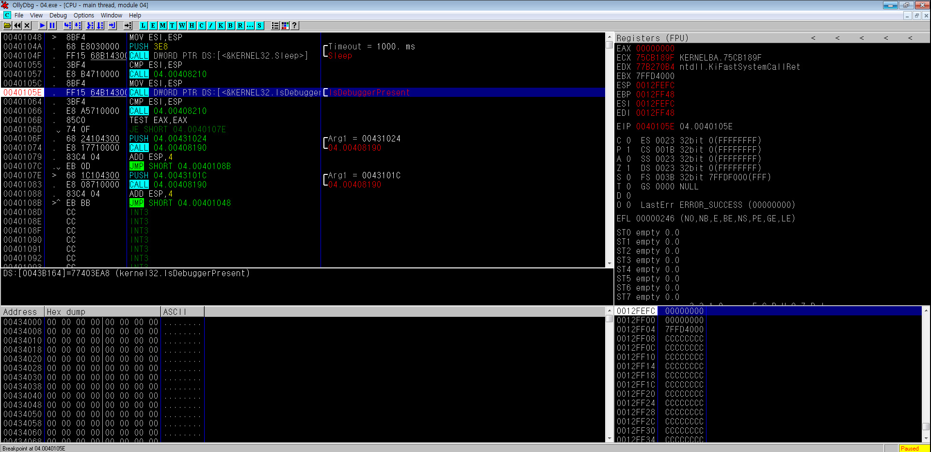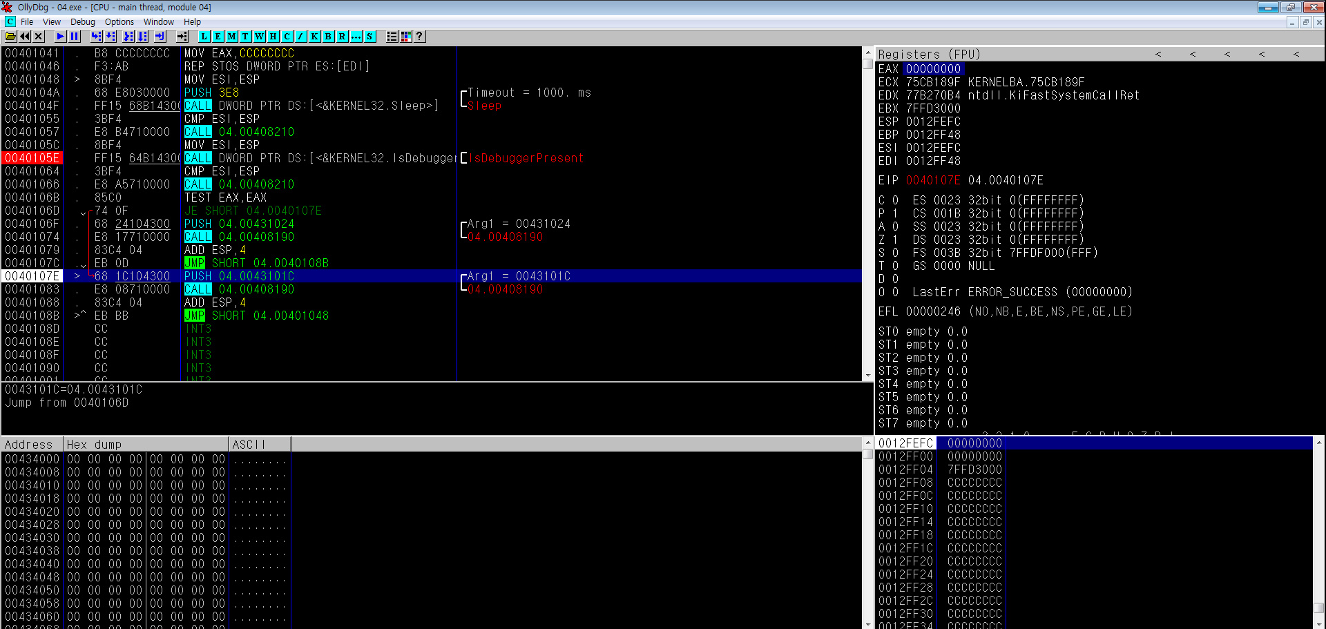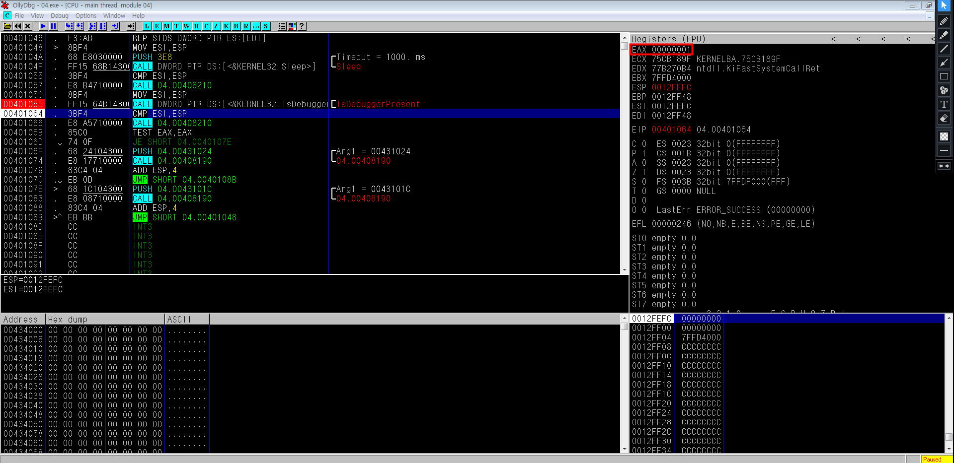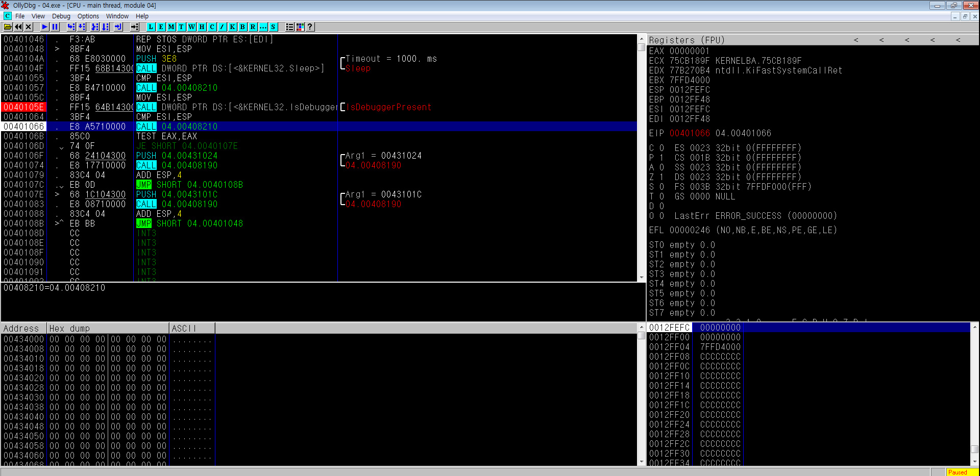 'IsDebuggerPresent'로 넘어가면 1로 변경되었음을 알 수 있기에