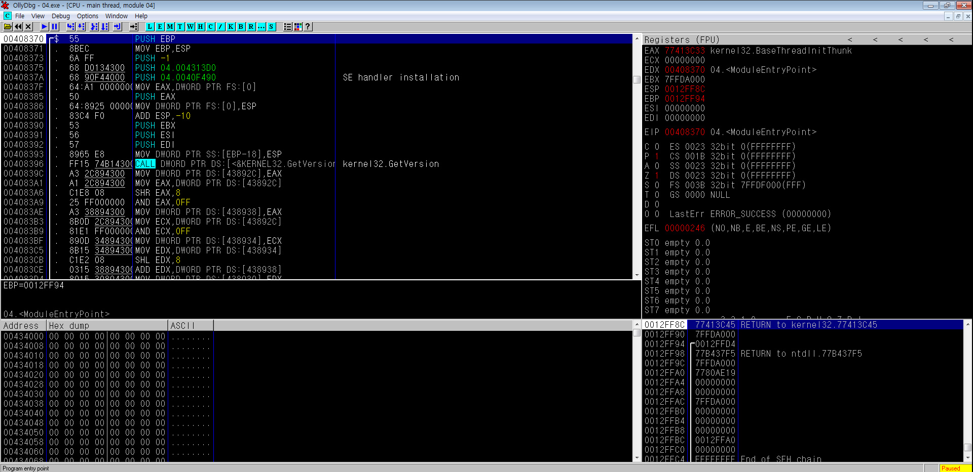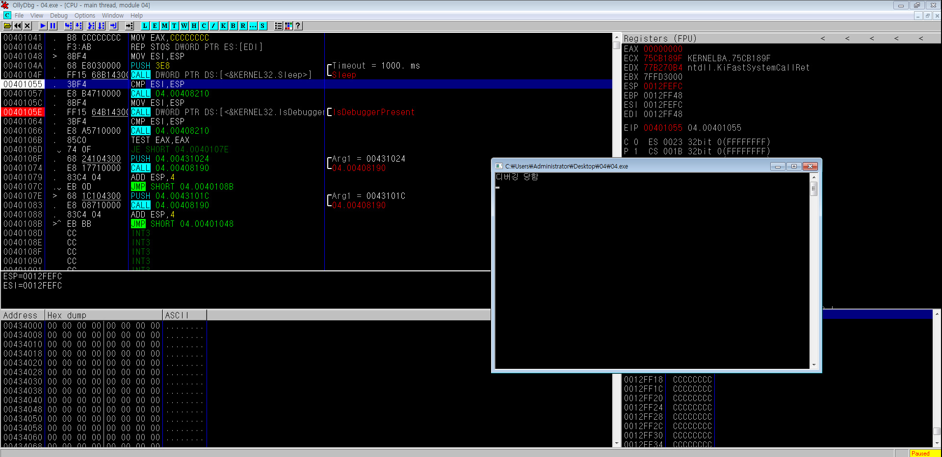 'OllyDbg' 도구를 이용해 04.exe 파일을 뜯어보자