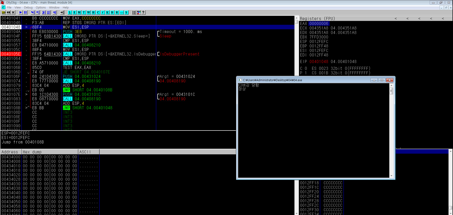 따라서 JE를 만나 두 값이 같지 않으므로 점프하지 않기 때문에 '디버깅 당함'이라는 문자가 출력되는 걸 확인할 수 있었다.