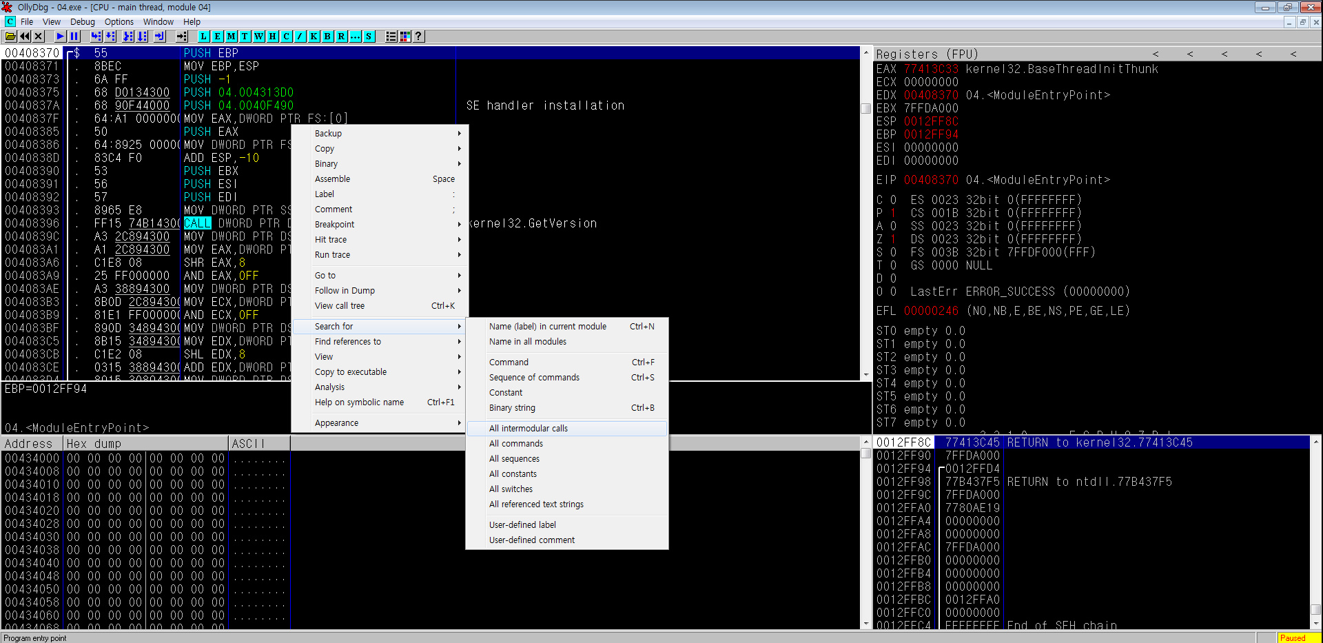 어셈블리코드 창에다가 우클릭 -> Search for -> All intermodular calls 를 클릭 해준다.
