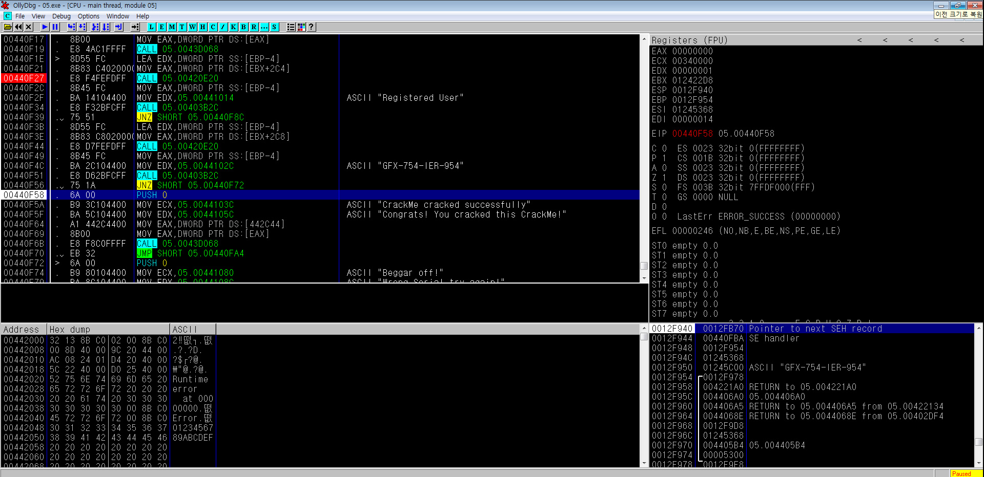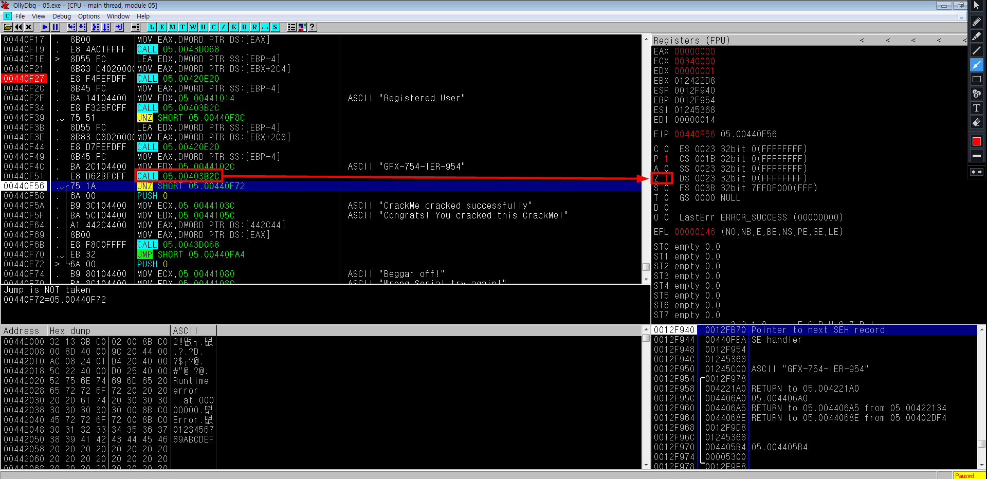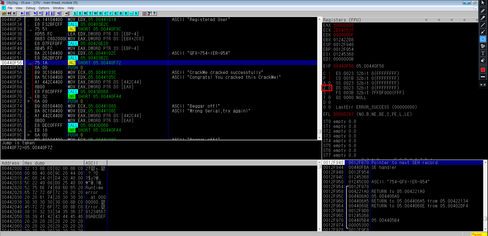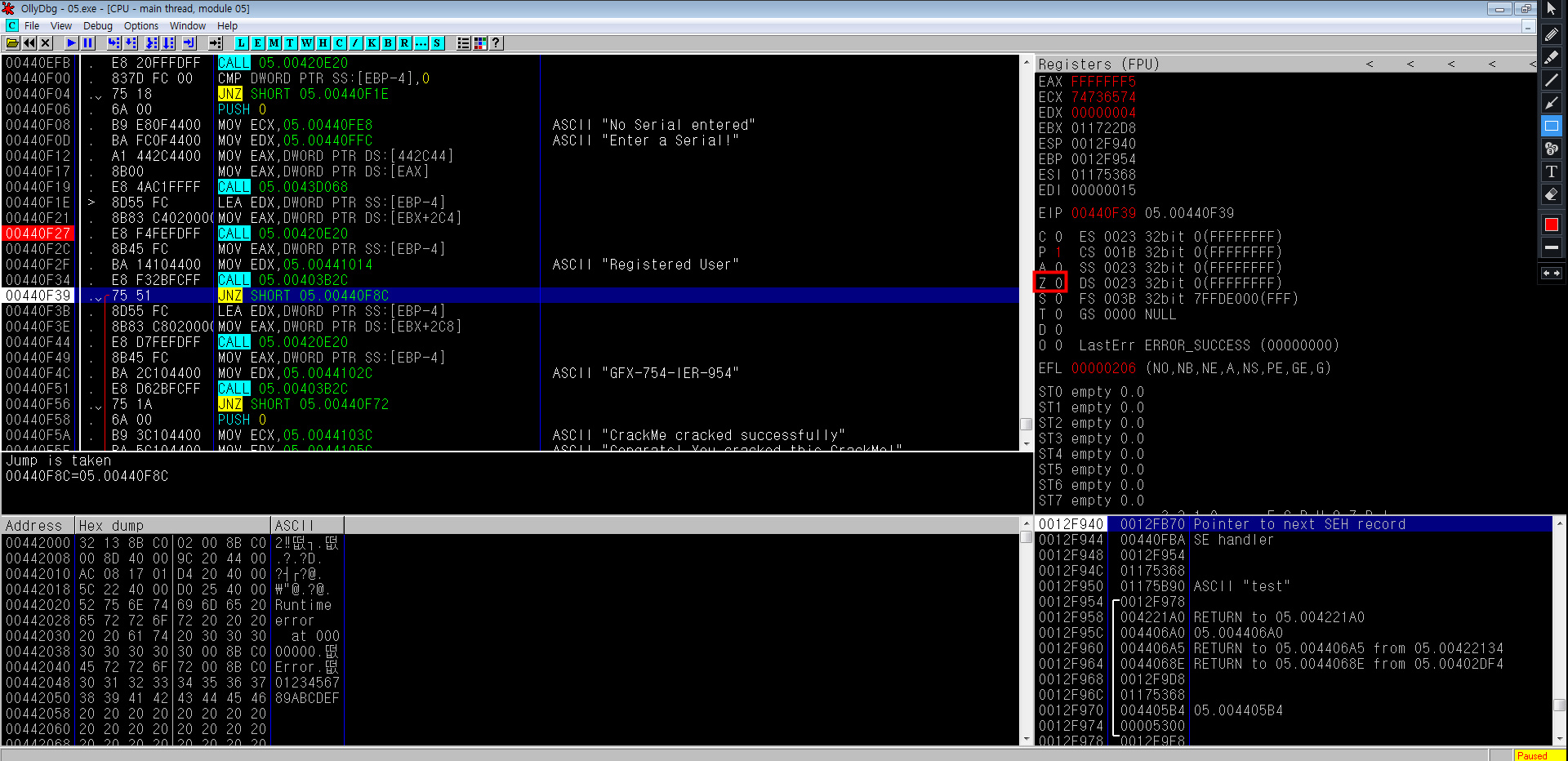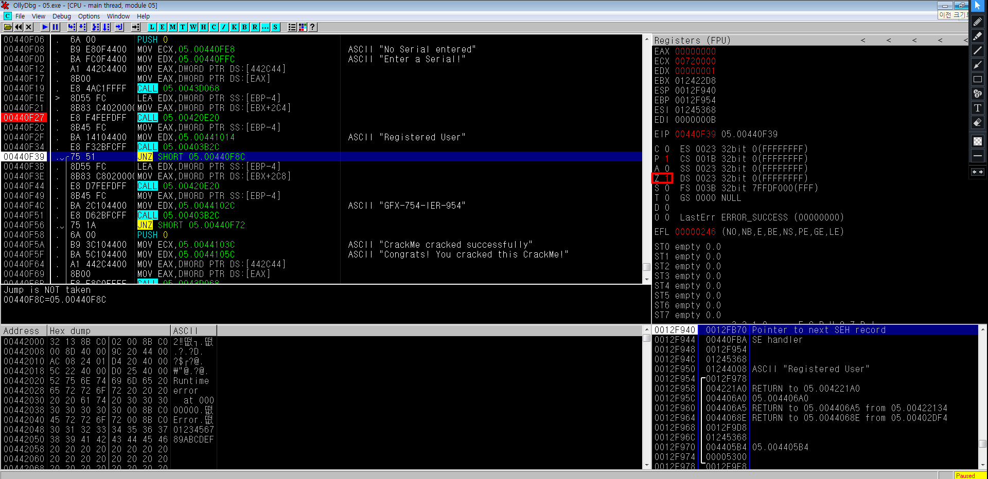 확인 결과 ZF가 0인 걸 알 수 있었고 밑 JNZ를 만나 시리얼 키를 확인하지 않고 바로 점프하는 걸 확인할 수 있었습니다.