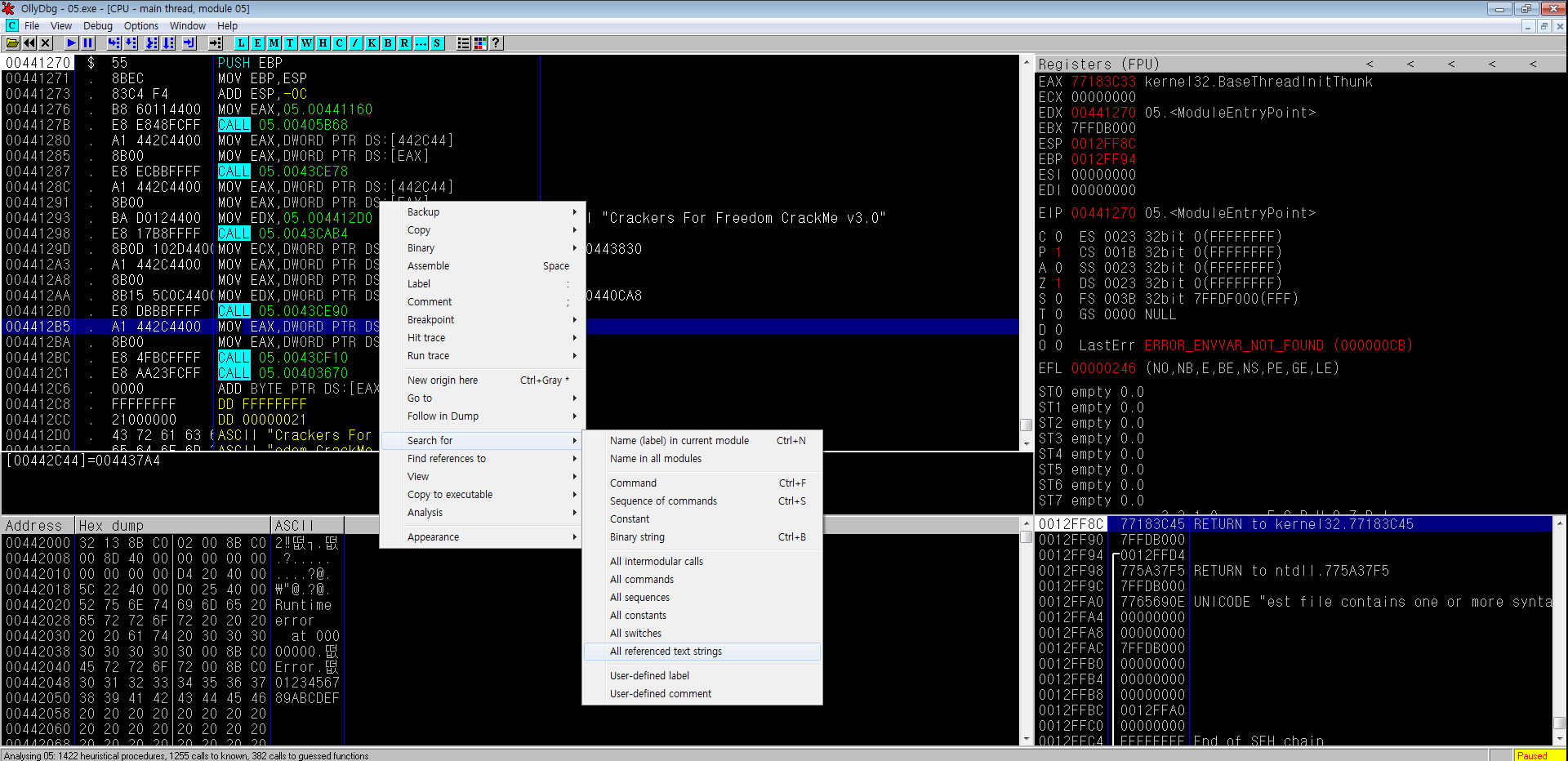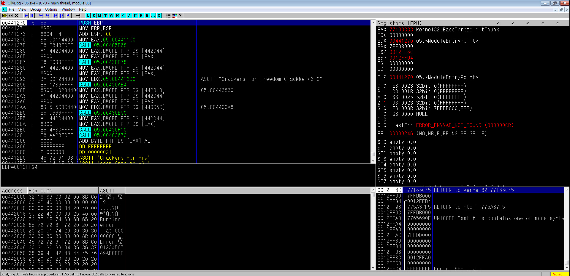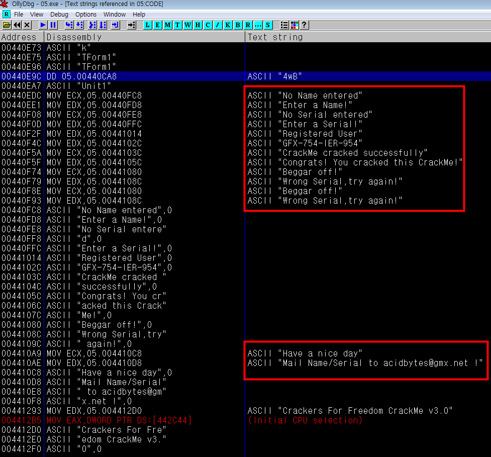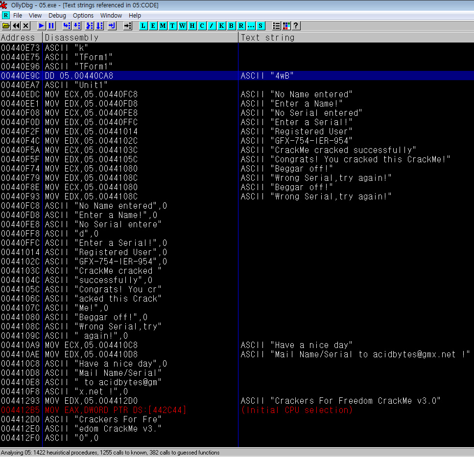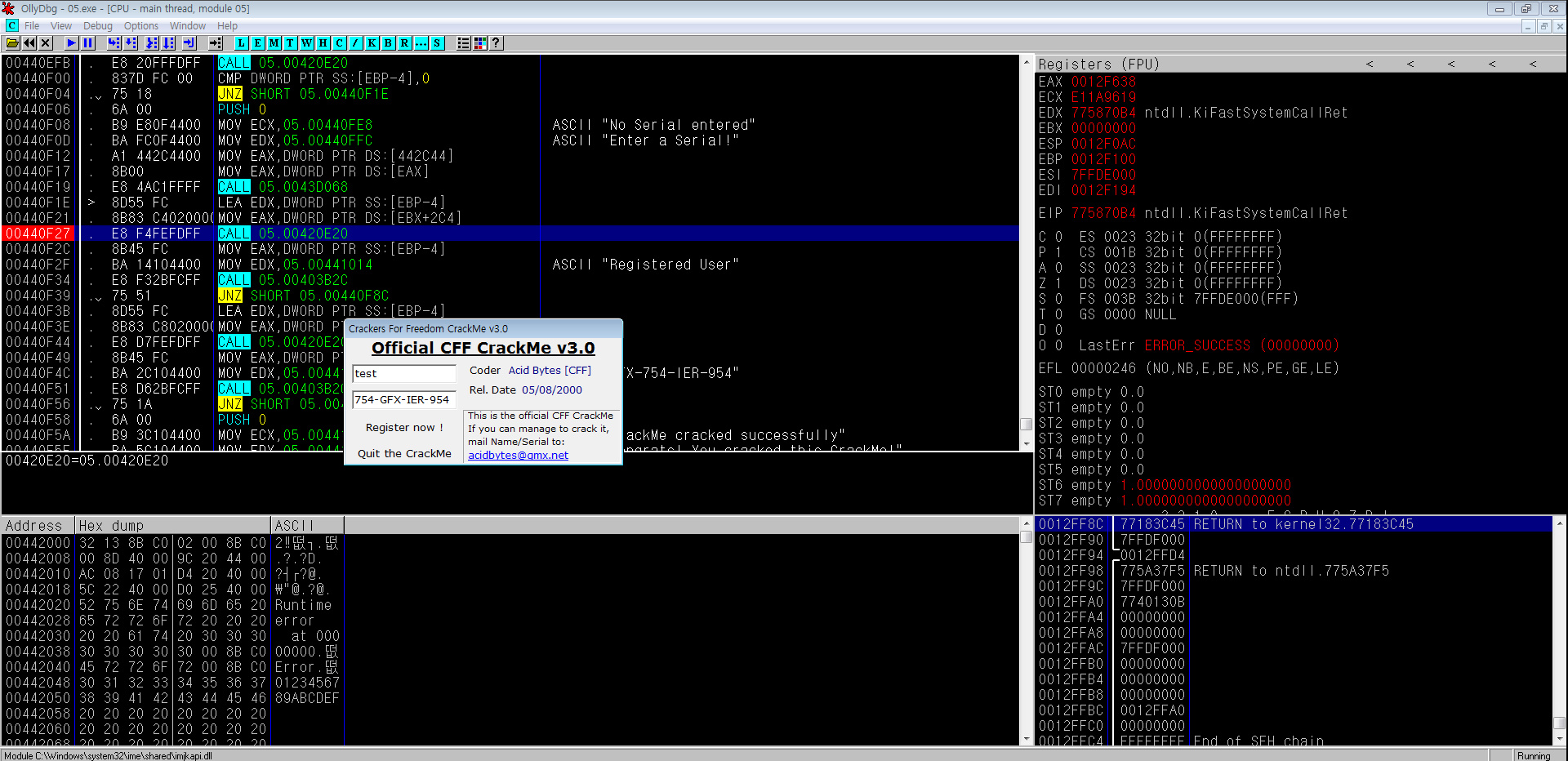 이제 'OllyDbg' 도구를 이용해 05.exe 파일을 뜯어보자