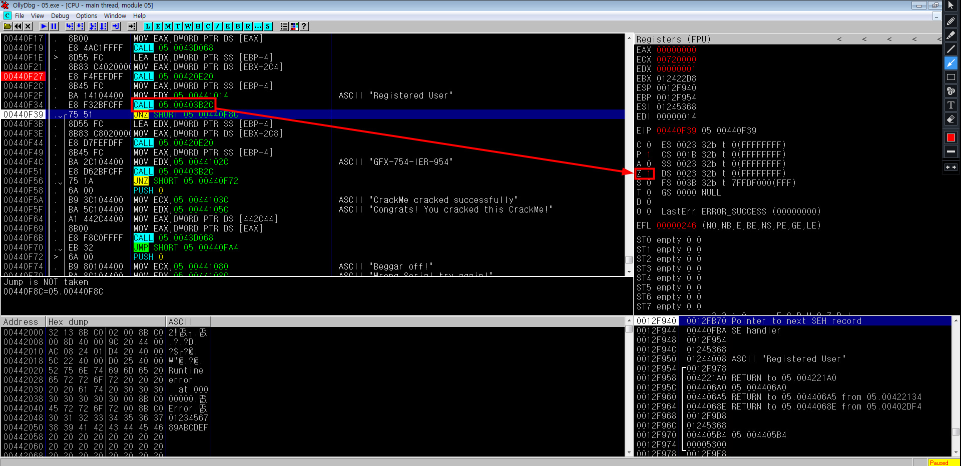 우리가 입력한 시리얼이 맞지 않기 때문에 ZF가 0인 걸 확인할 수 있었다.