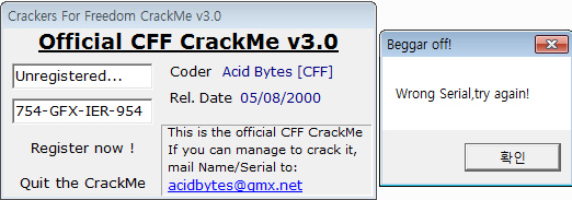 'Register now !'를 누르게 되면 "잘못된 시리얼, 다시 시도하십시오!" 라고 뜬다.