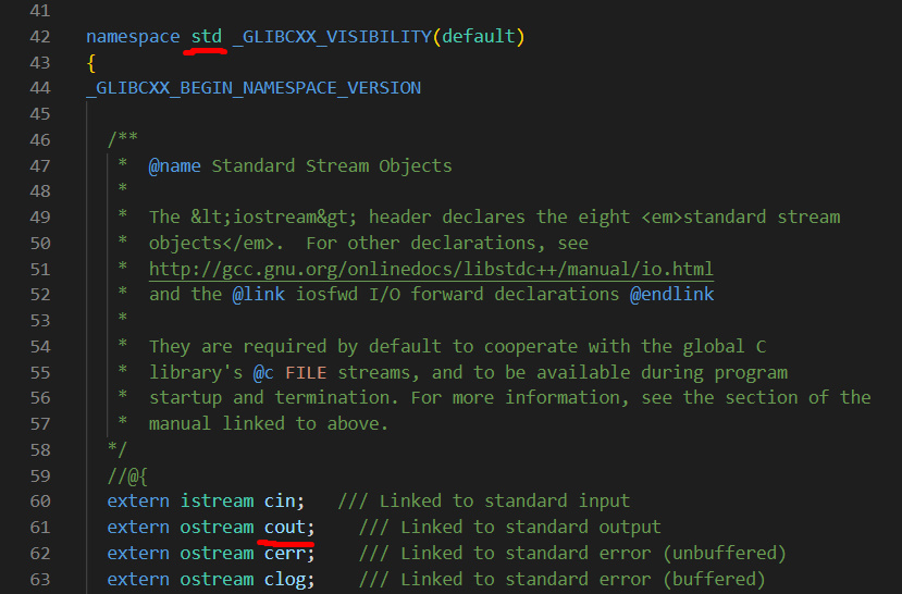 그 이유는 cout, endl 은 iostream에 정의 되어 있는 함수인데 Ctrl을 누른 상태에서 iostream 클릭 해서 안으로 들어 가면 함수가 정의 된 곳을 볼 수 있다.