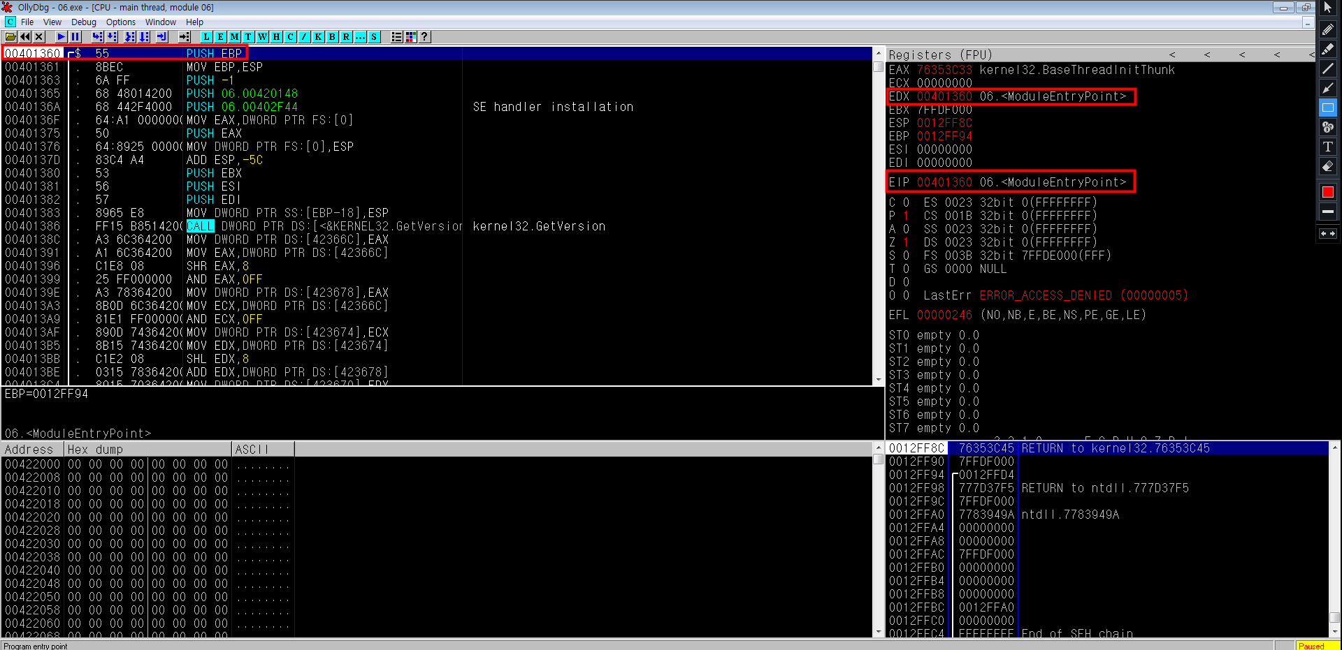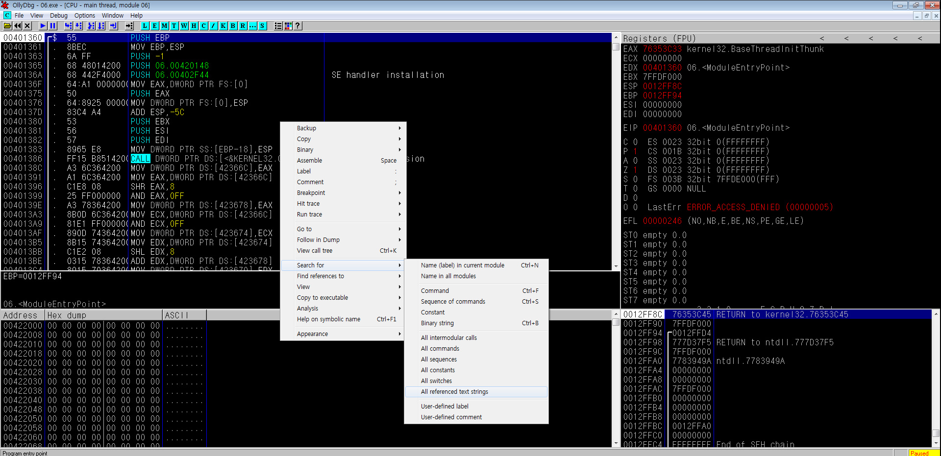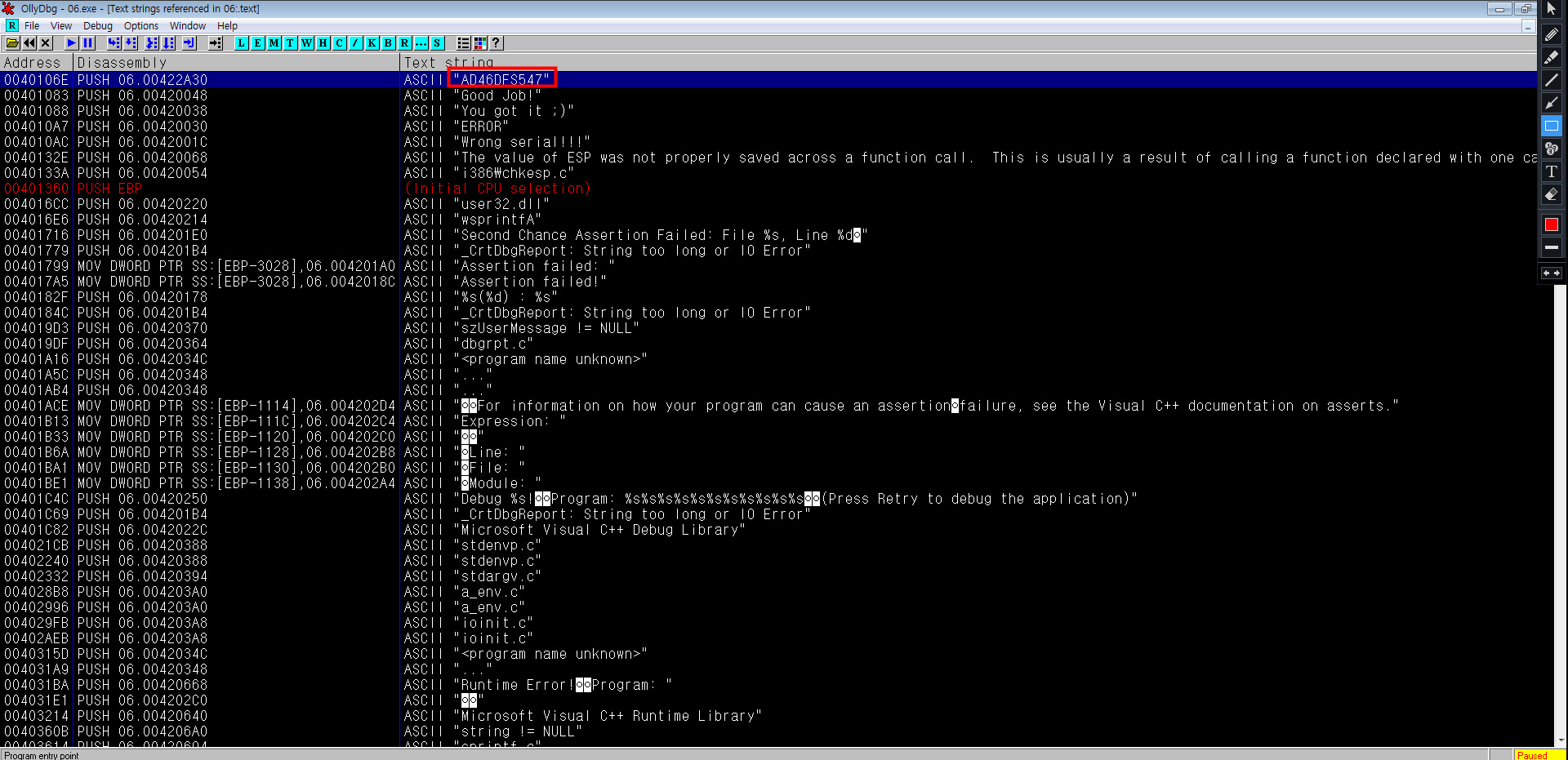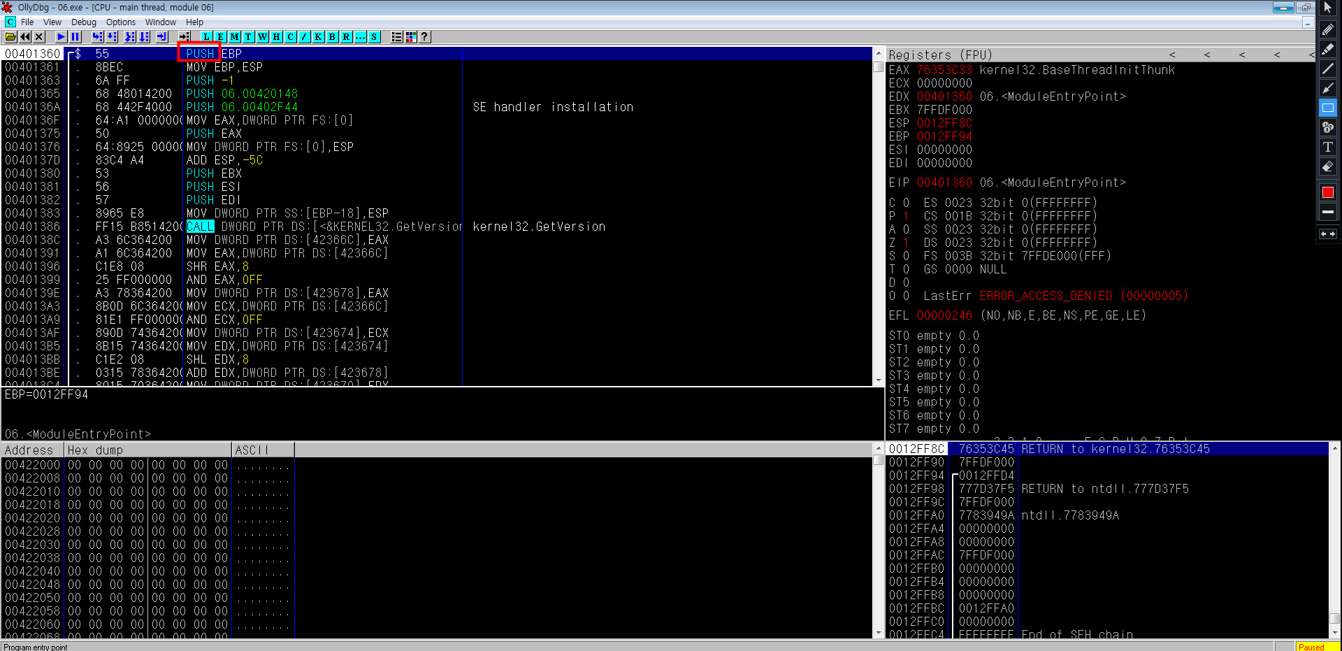 다시 'OllyDbg' 도구를 이용해 06.exe 파일을 뜯어보자