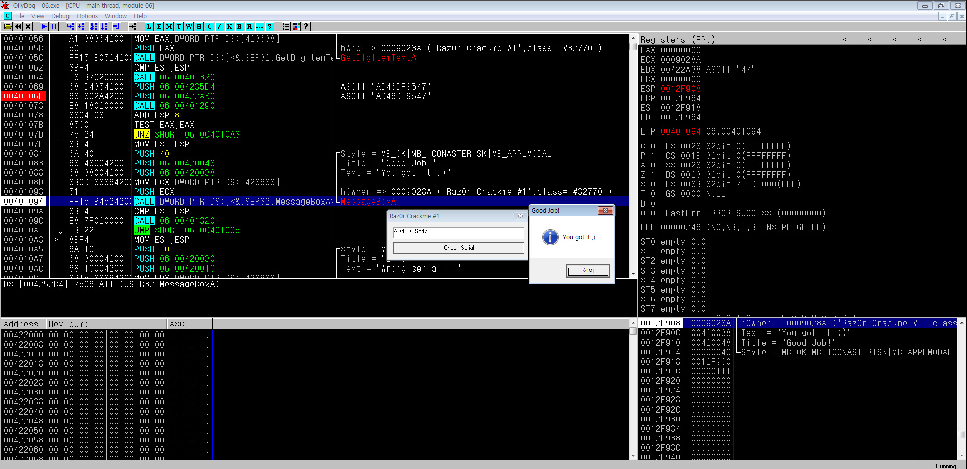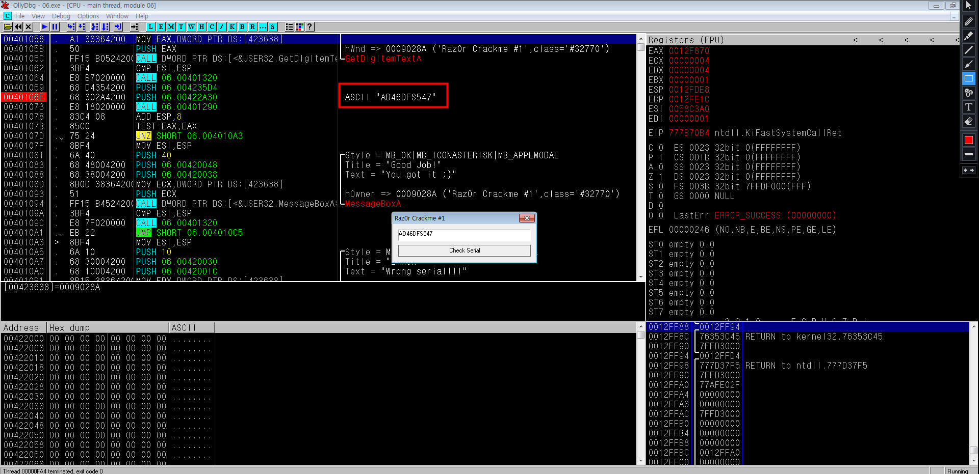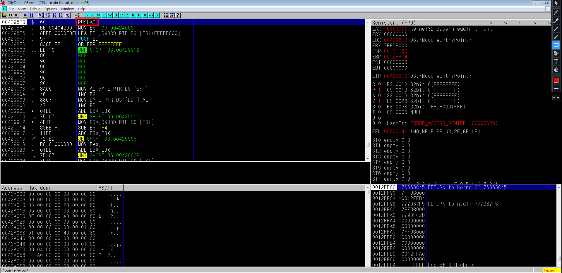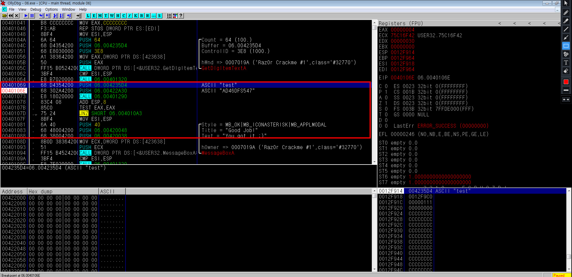 다시 'OllyDbg' 도구를 이용해 06.exe 파일을 뜯어보자