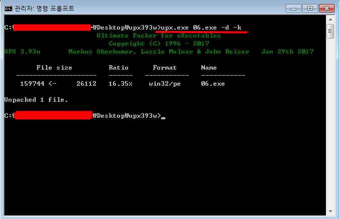 (-d -k 뜻이 모르는 사람은 cmd에서 upx.exe를 실행시키면 도움말이 나온다.)