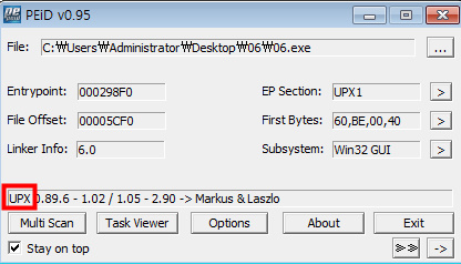 UPX로 패킹 되어 있는 걸 확인할 수 있다.