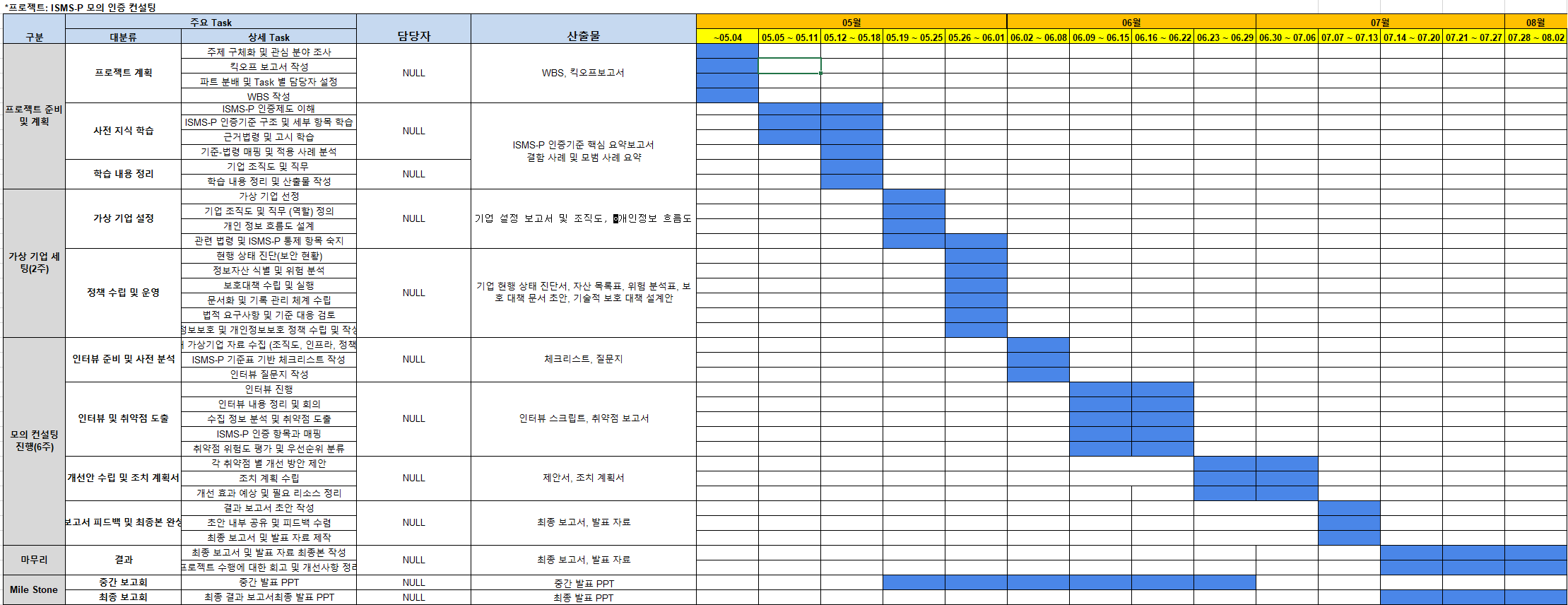 - 입력: ISMS-P 요구사항, 팀 가용자원 (총